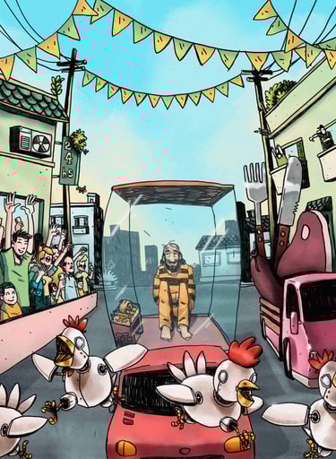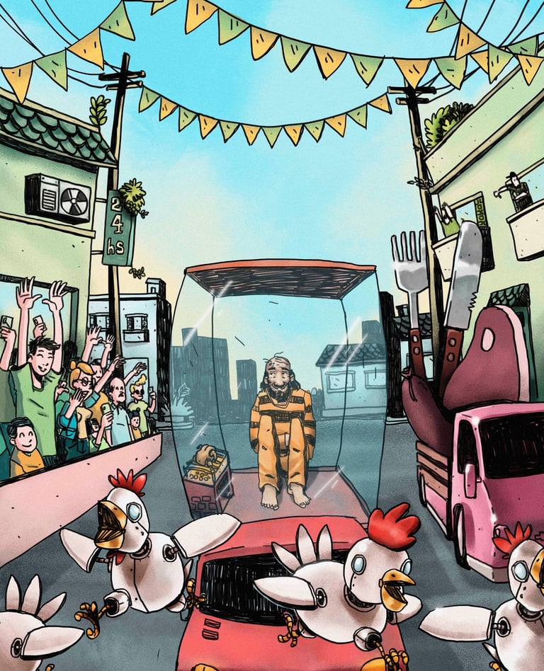 Aun varias semanas después de celebrarse el centenario los festejos continúan llevándose a cabo. Ensaladeras comunitarias, enormes bloques de tofu, ollas populares de arroz yamaní con rawmesan, frutas y más frutas, cientos de postres y otras delicias cubren las mesas de las fiestas. Como evento especial organizado por el gobierno se decidió llevar a Marcelo Pilote a la marcha de la vergüenza, un desfile en el que se hacen carrozas que transportan objetos del pasado que causan vergüenza: ordeñadoras automáticas; diferentes tipos de jaulas: de pájaros, de criaderos y de zoológicos; productos de cosmética en los que hacían testeos con animales; maderas utilizadas en verdaderos corrales; trajes y accesorios de toreros; esquiladoras; una carroza cargada de mascarillas con tubos que usaban las tabacaleras generalmente en perros pequeños como los Beagle, para testear la toxicidad de sus productos; y otra con partes de una maquinaria con embudos y tubos que se usaba para separar los pollitos hembra de los macho y que cada cual sufriera distintas atrocidades.